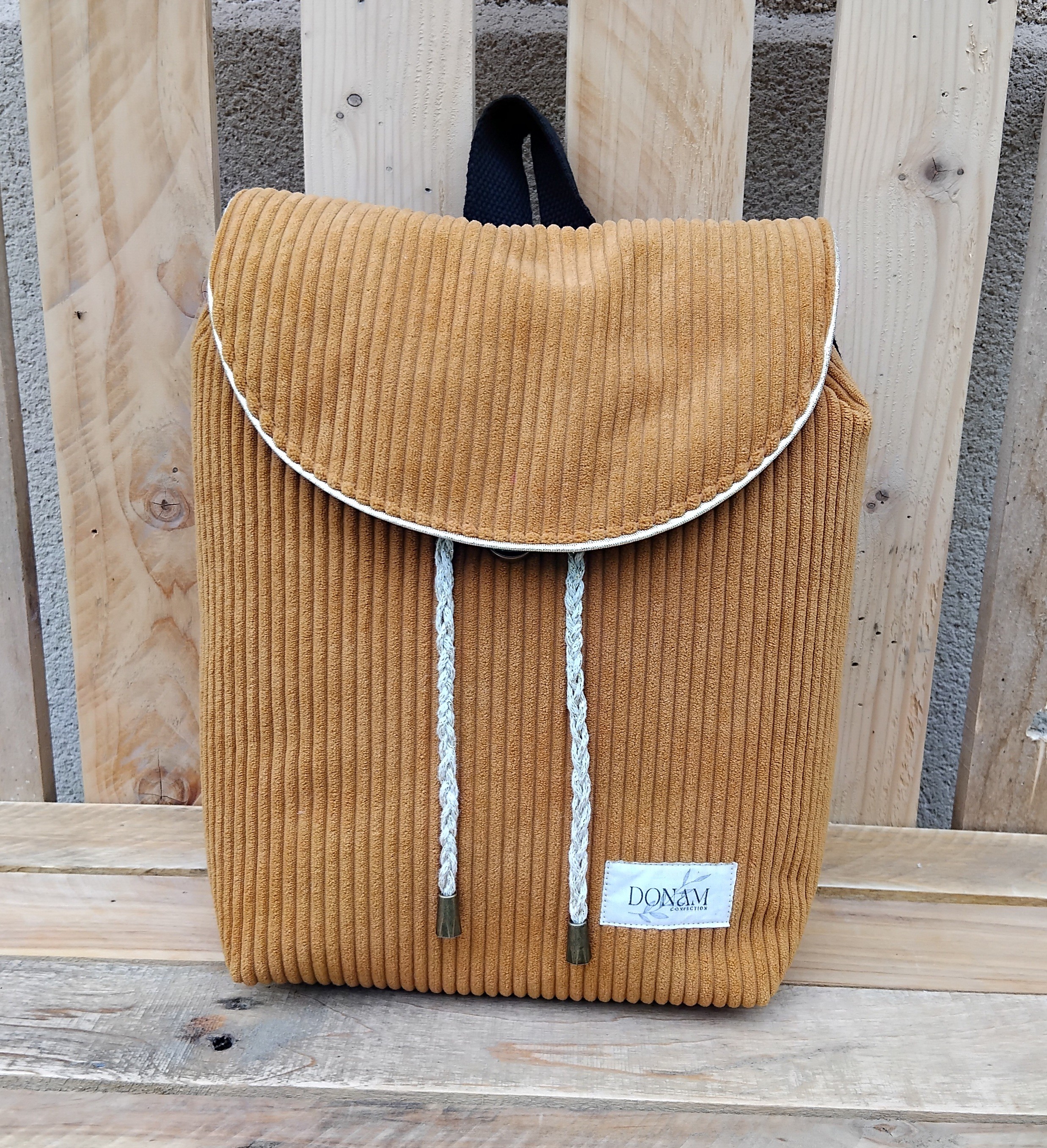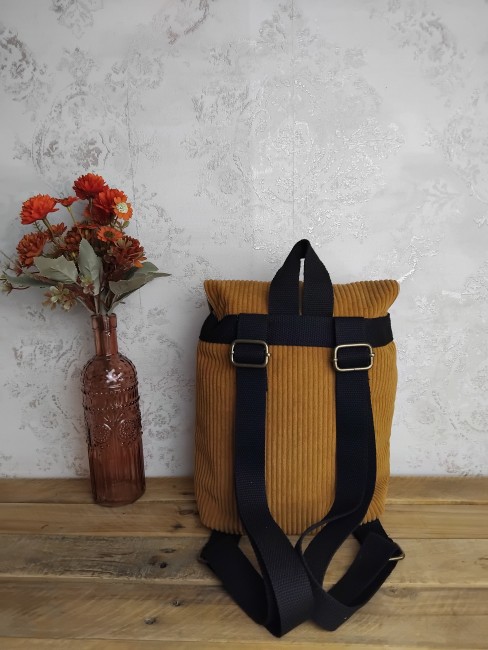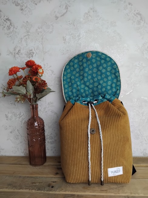 Ce sac à dos est en velours, doublé d'un coton à motifs variés et d'un molleton.
