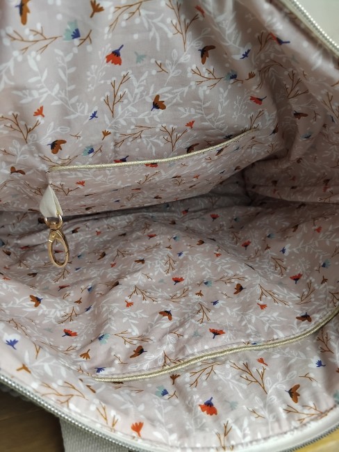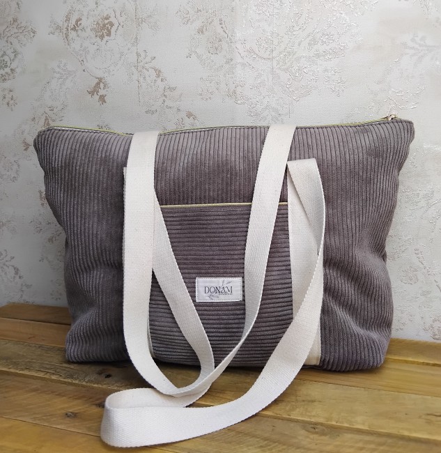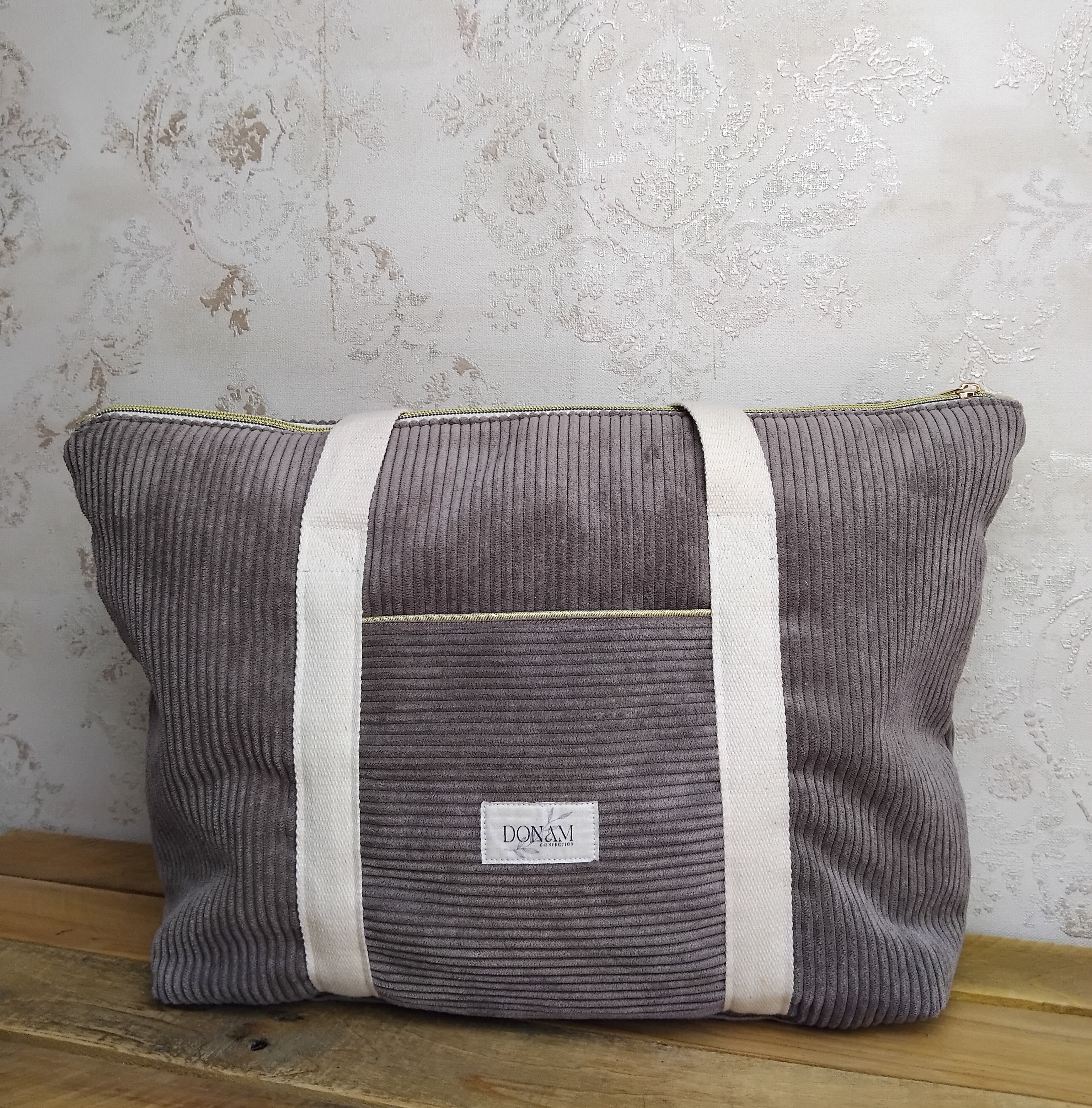 Le sac est en velours côtelé, doublé d'une cotonade à motifs variés et d'un molleton.