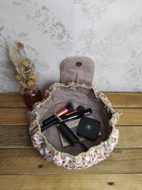 Trousse à maquillage matelassée ronde fleuris fond blanc