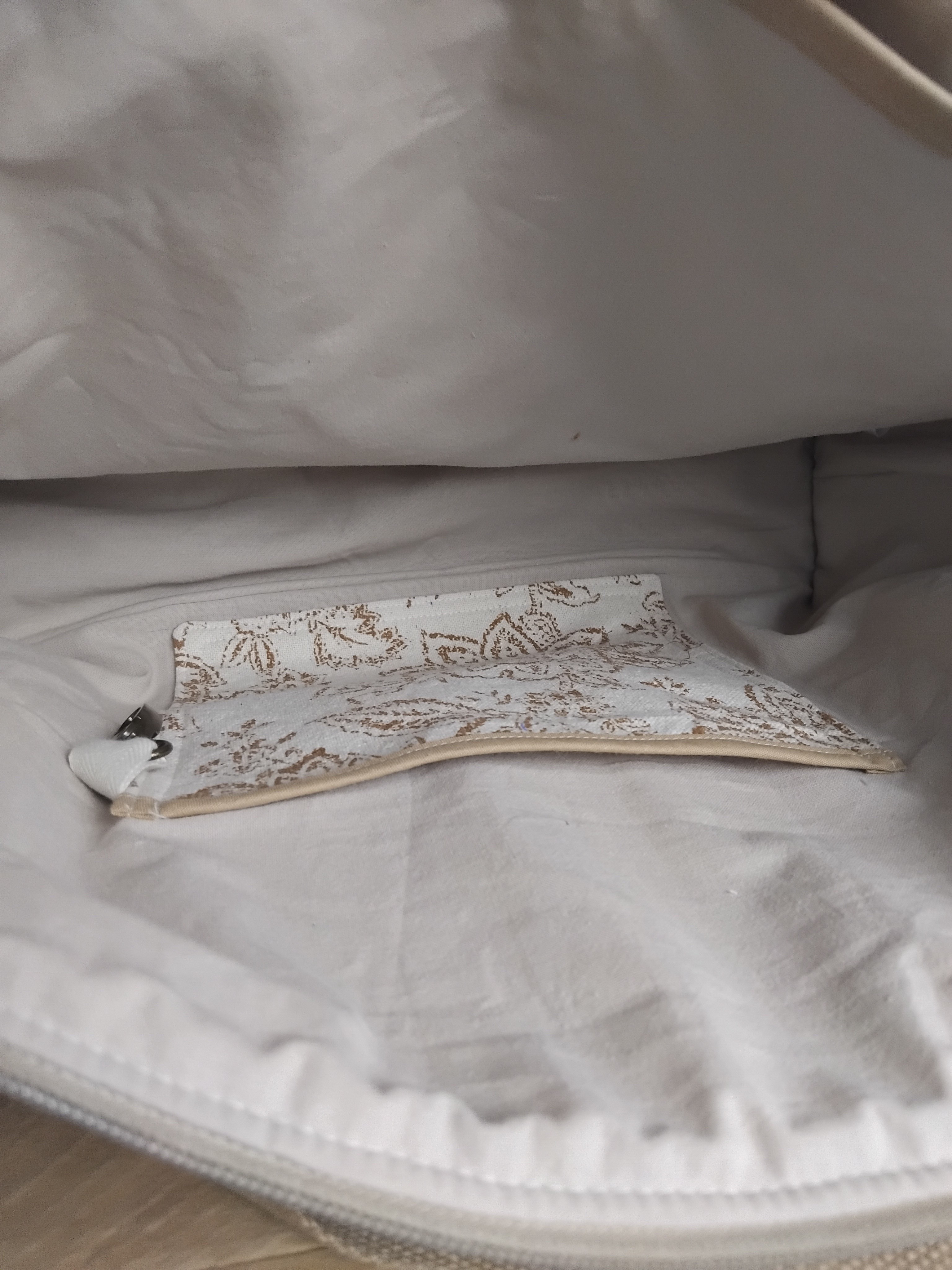 A l'intèrieur vous trouverez d'un côté une grande poche dans lequel peut se loger un ordinateur portable et de l'autre une plus petite poche ainsi qu'un porte clés afin qu'elles ne se perdent pas au fond du sac.