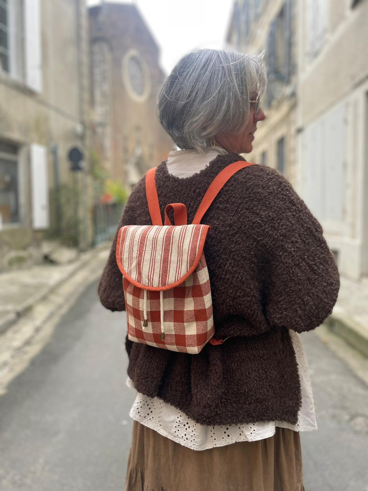 Ce sac à dos est en coton tissé, doublé d'une cotonnade unie et d'un molleton.