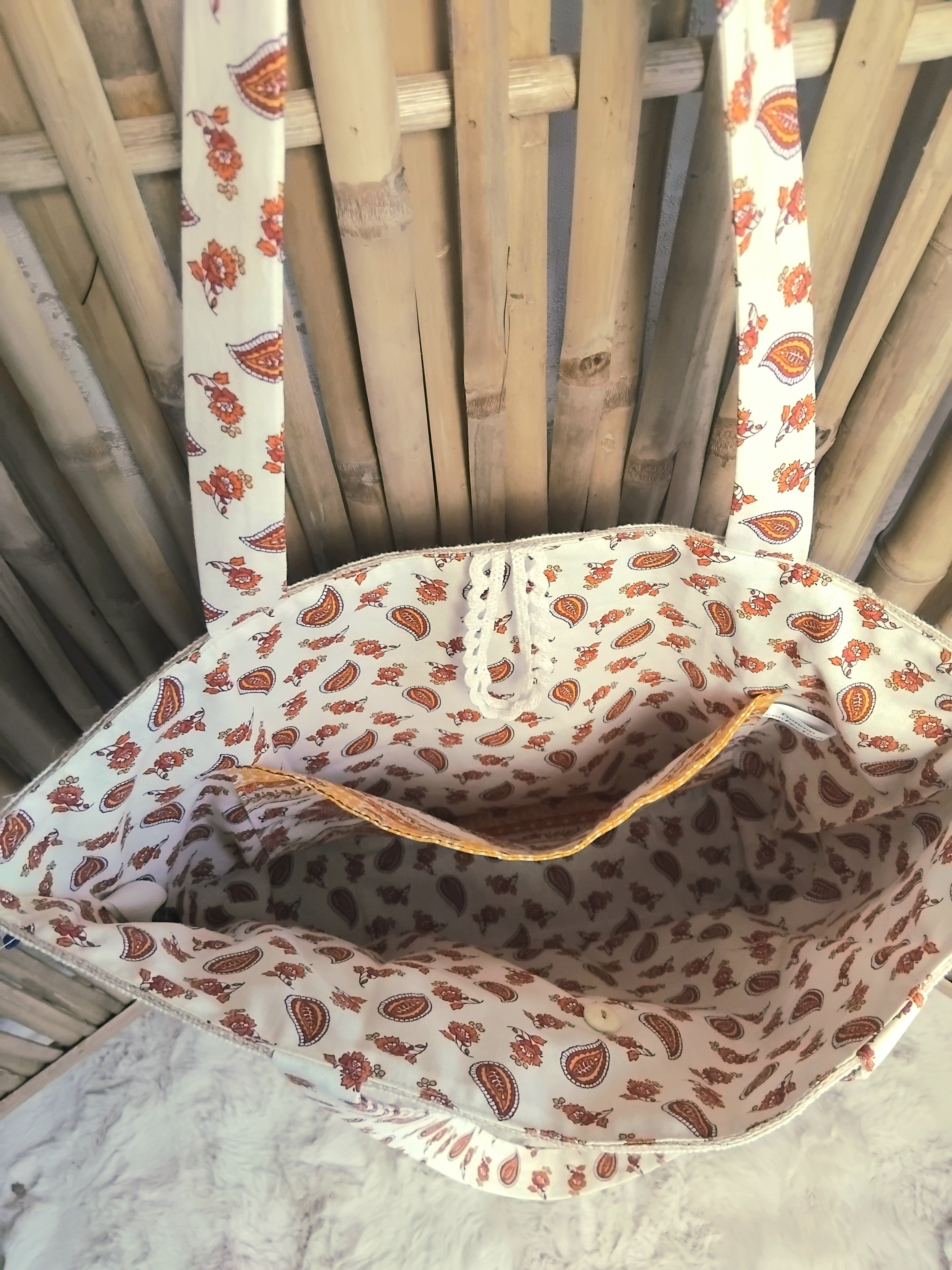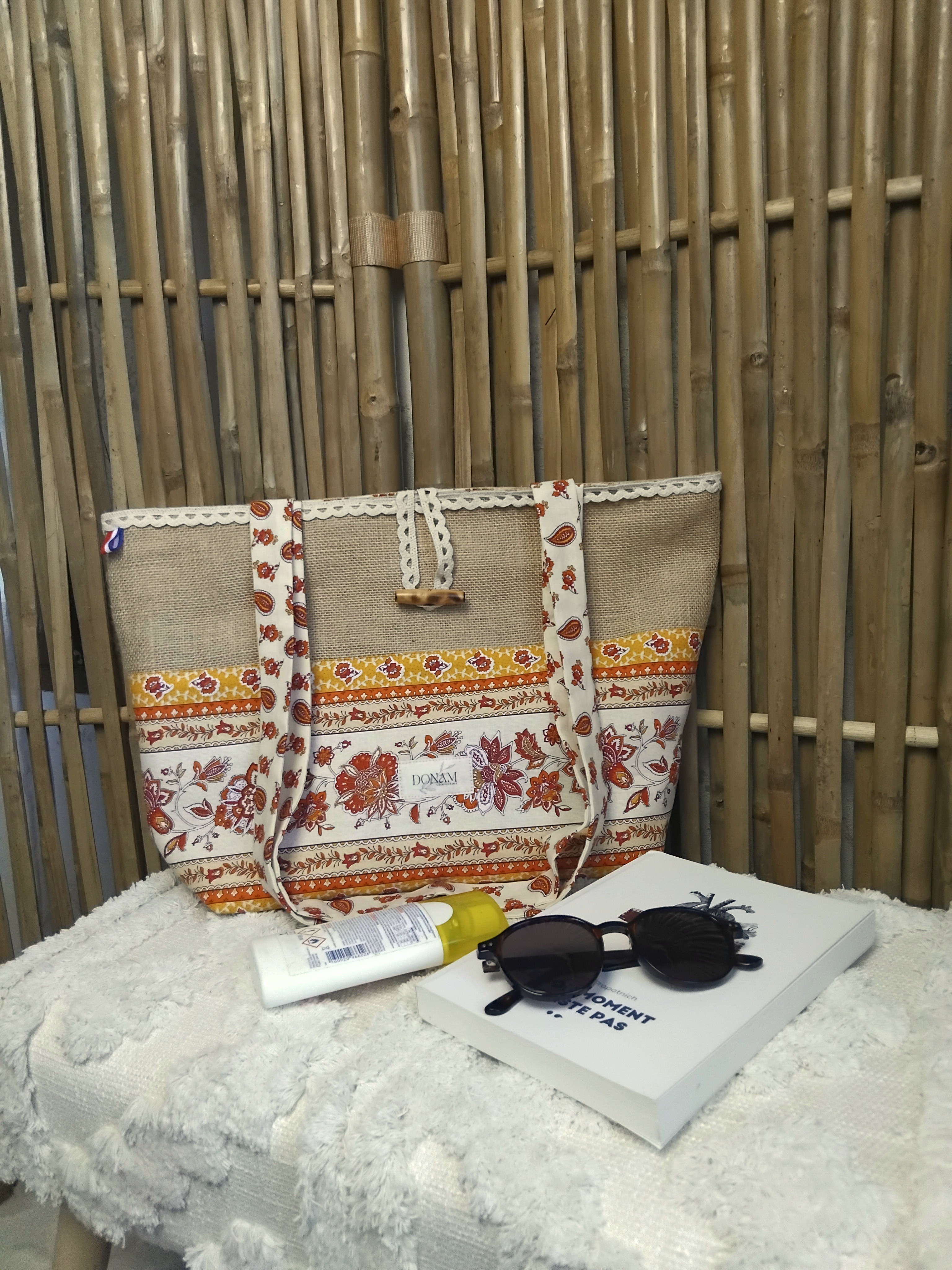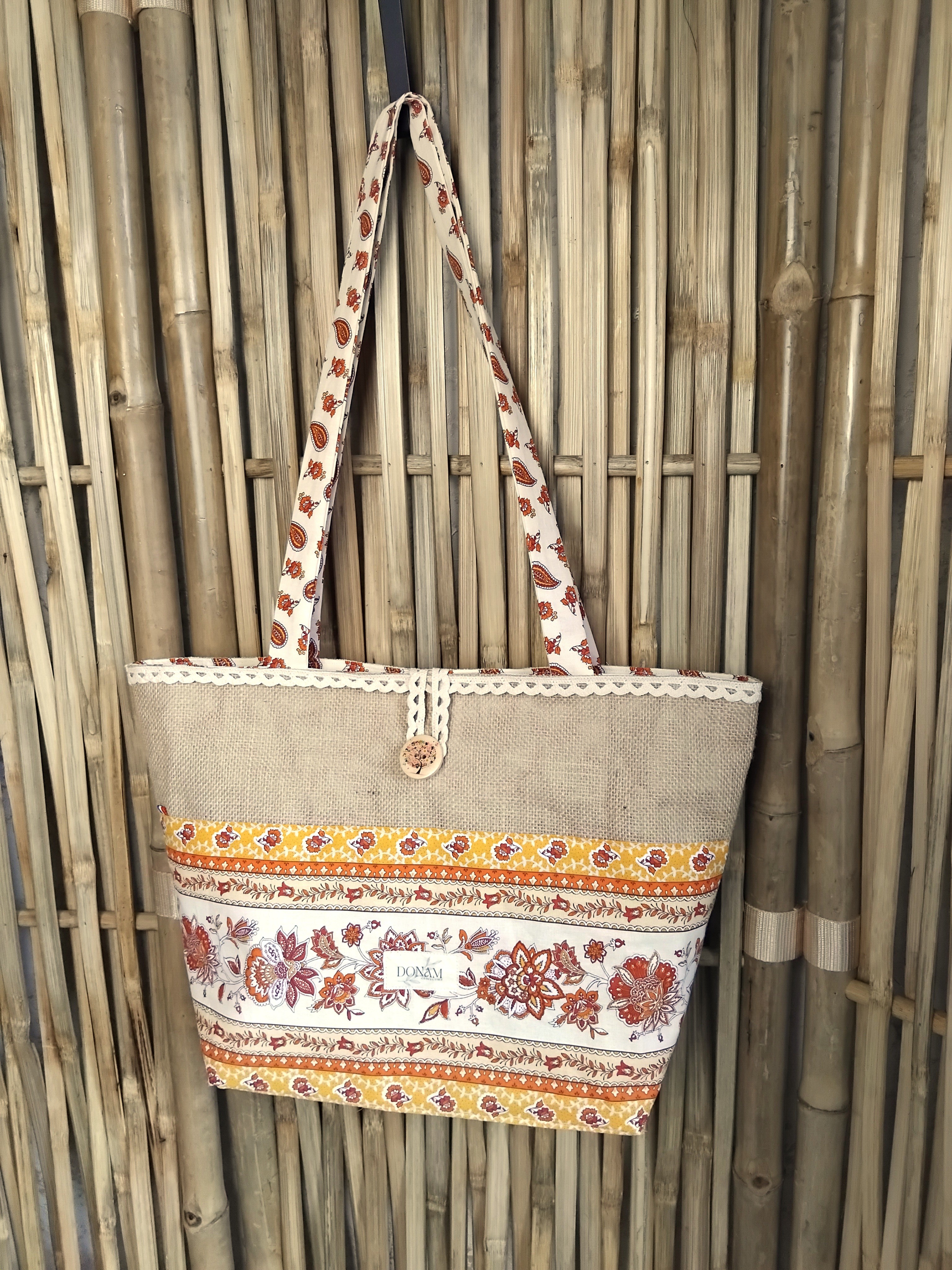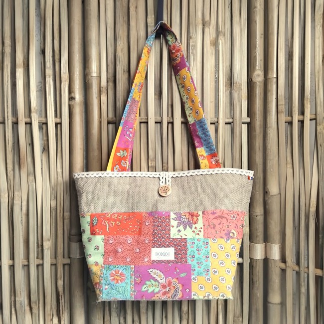 Sur le devant, une jolie cotonnade ensoleillée vient parer ce sac ainsi qu'une dentelle sur le dessus.
