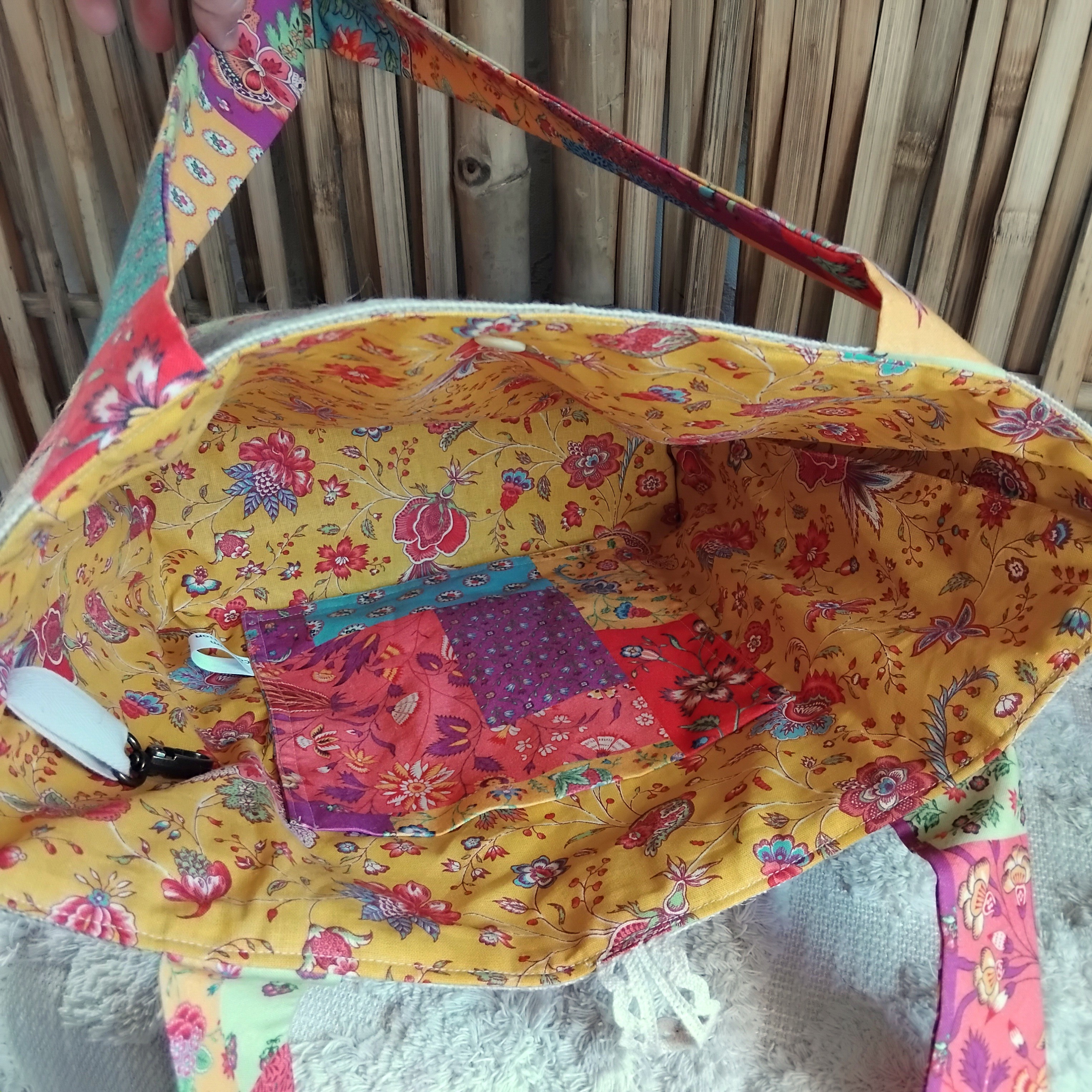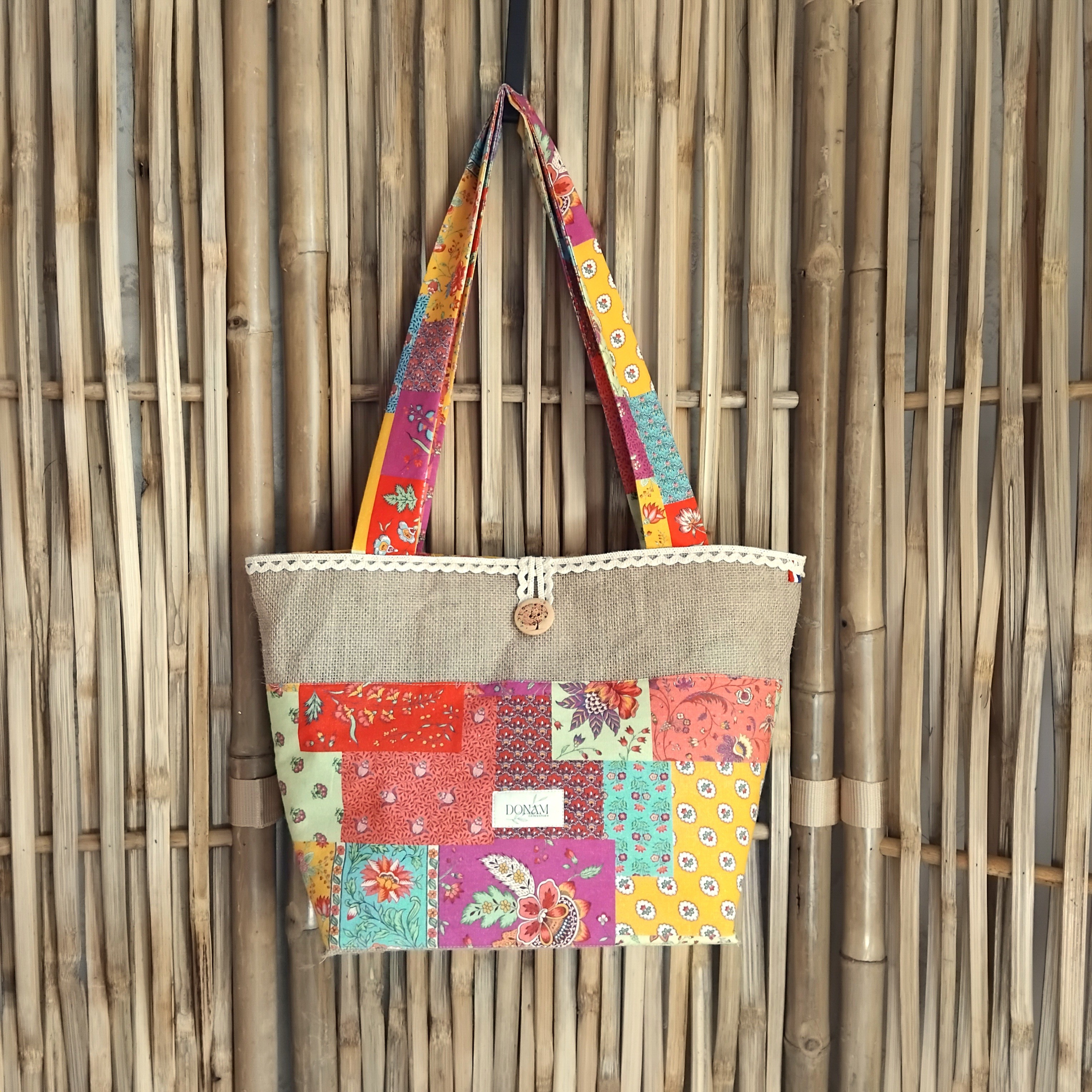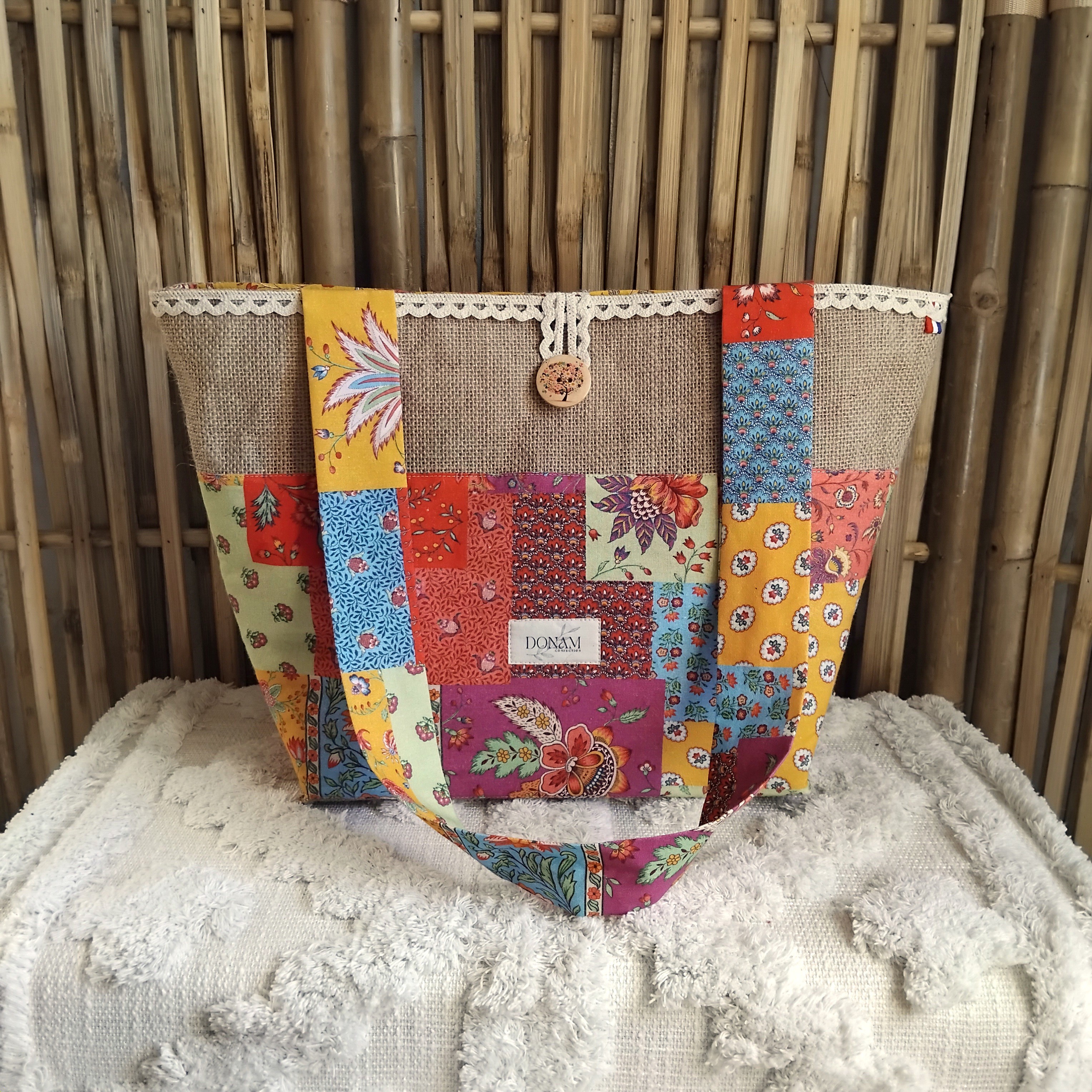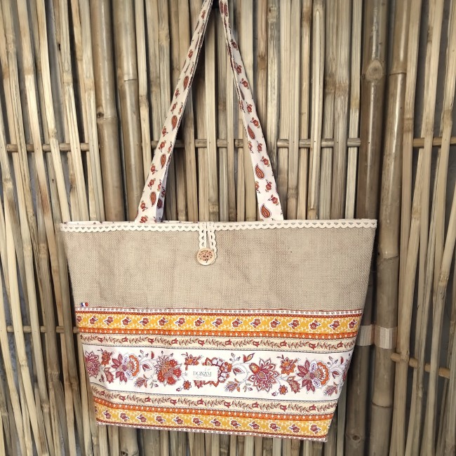 Sur le devant, une jolie cotonnade ensoleillée vient parer ce sac ainsi qu'une dentelle sur le dessus.